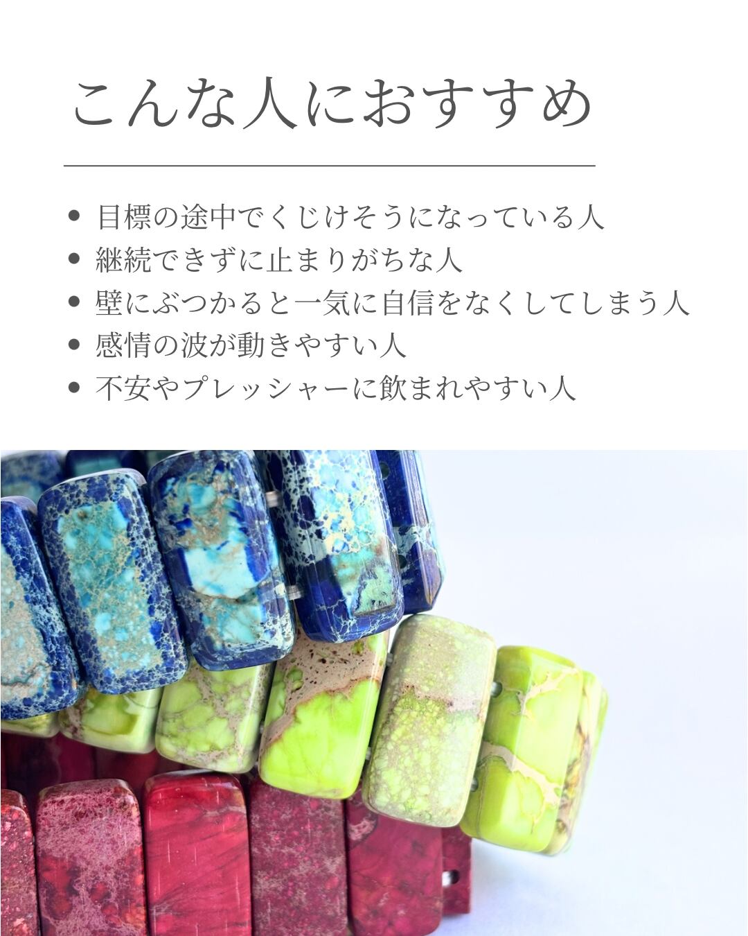 様々なサイズの天然石を使い、デザイン性を高め、天然石ブレスレットの数珠感を感じさせません。