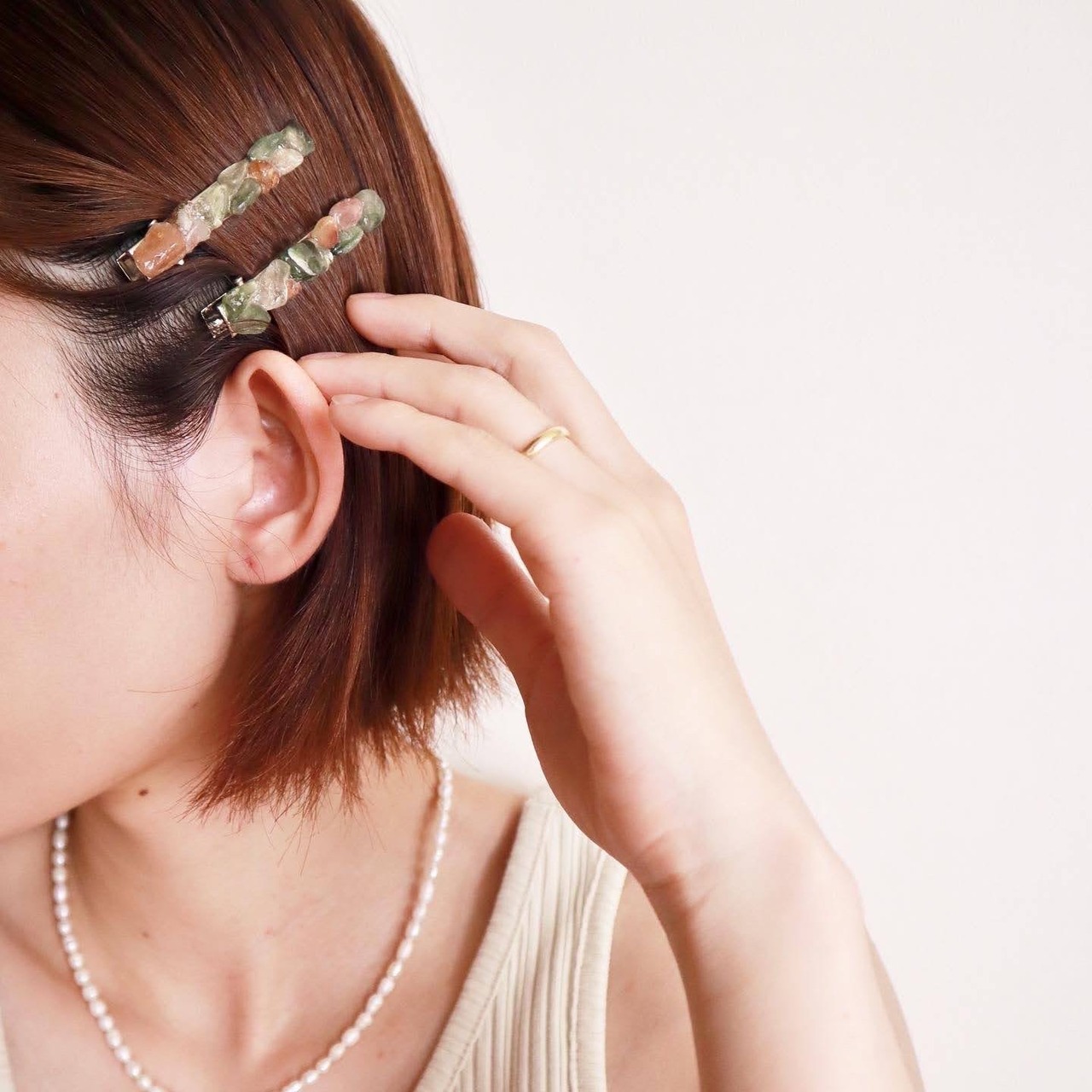 結んだだけの髪にちょこんと添えるだけ。天然石を散りばめたヘアクリップが一気にこなれ感を演出してくれます。